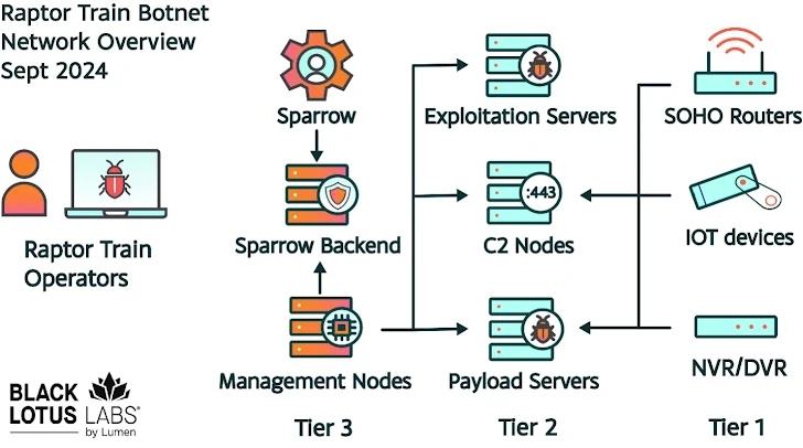 Raptor Train is a sophisticated and large-scale botnet active since May 2020. It has compromised more than 260,000 IoT devices and small business networks, including routers and IP cameras. This botnet is attributed to the Chinese state hacker group Flax Typhoon, known for its cyberespionage campaigns targeting critical infrastructure in the United States, Taiwan and other countries. This group uses a complex, multi-layered botnet architecture, making it a persistent threat that is difficult to eradicate.