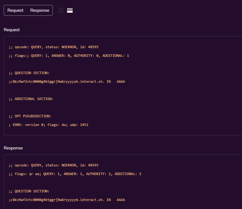 After sending the request, the domain search appears on interactsh: