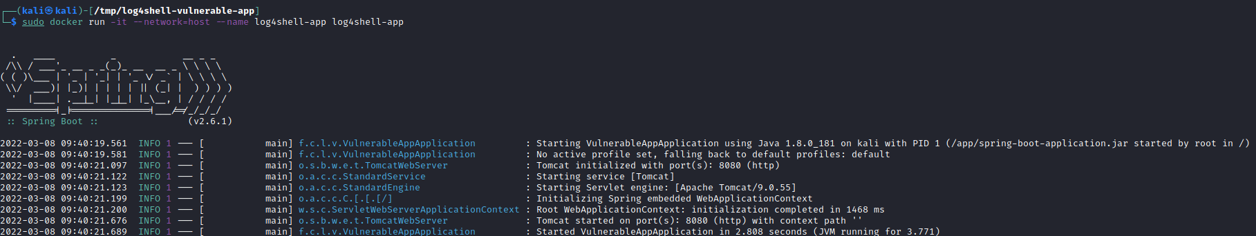 sudo docker run -it --network=host --name log4shell-app log4shell-app