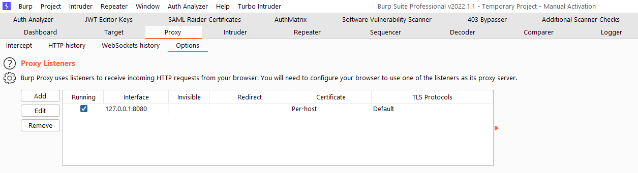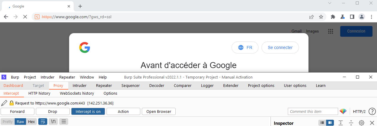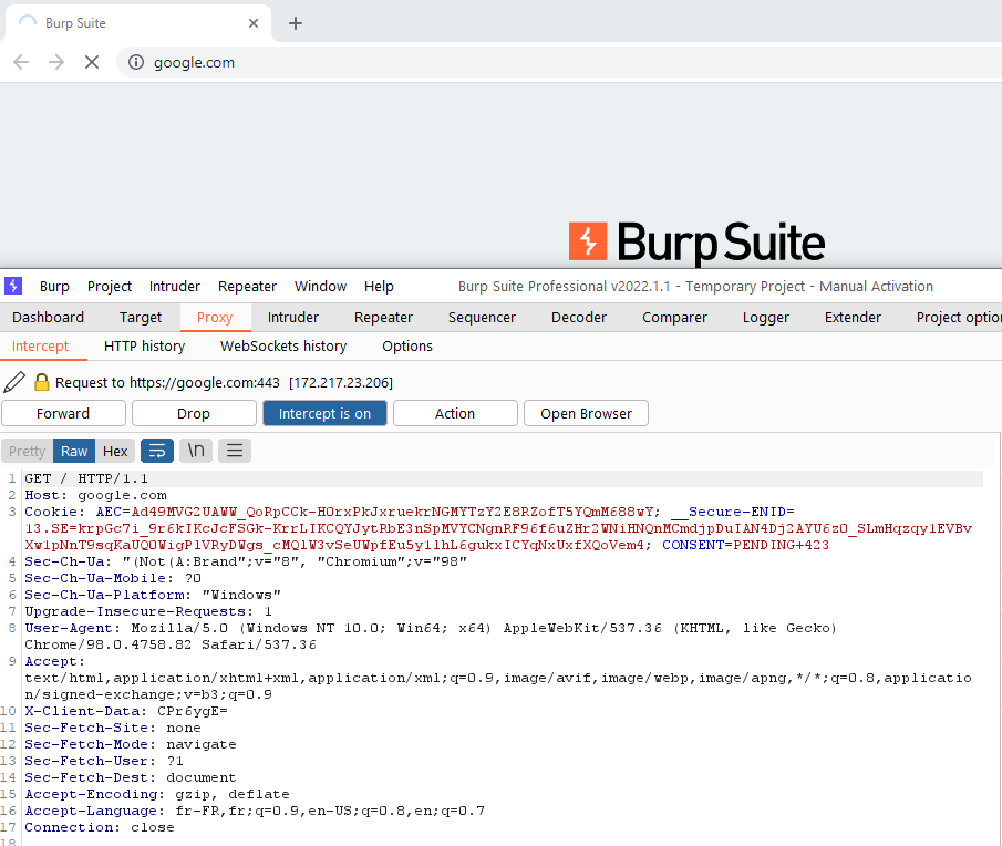 Using Burp's browser or your browser with the FoxyProxy addon, try visiting a site (example: google.com) and observe that the site does not load.