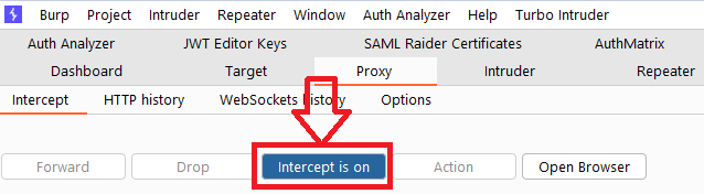 Due to the number of requests that browsers typically send, you often won't want to intercept every single one. Click the “Intercept is on” button to turn interception off.