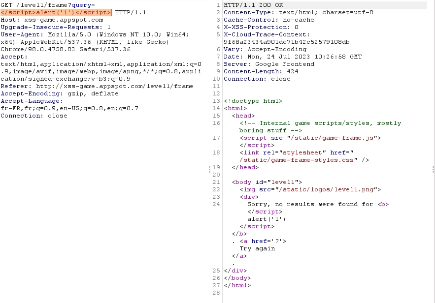 It is therefore possible to modify our query on the left to try to find the flaw and move to level 2 of our XSS game.