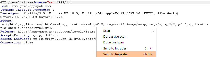 Now we will right-click on the query and do "Send to Intruder" or the keyboard shortcut "CTRL-I":