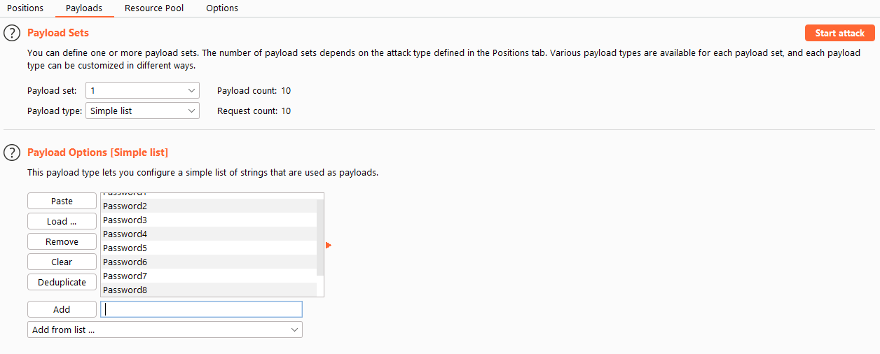 For this example, I'll create my own list of 10 possible passwords by typing them in and clicking add. Since payload "1" was selected in the payloads section, this applies to my first parameter, which is the password.