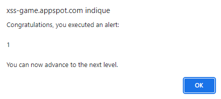 -> We do get a “pop-up” which indicates that the vulnerability has been exploited and that we can move on to the next level.