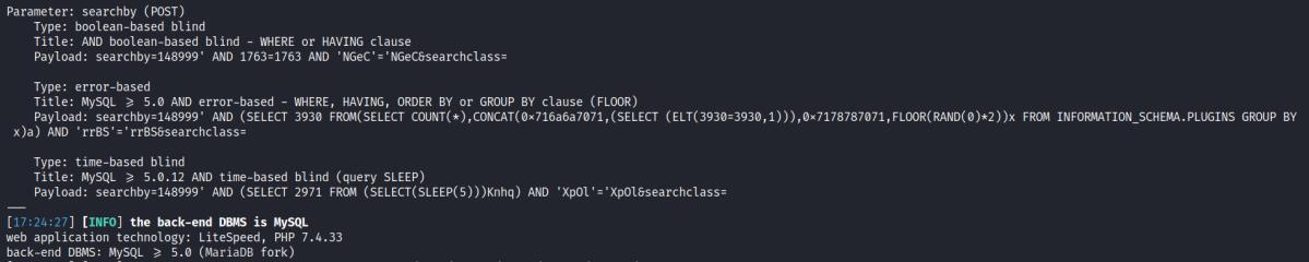 An error message from the application suggests that the input from the searchby parameter is being interpreted as SQL code, indicating a lack of proper input sanitization.