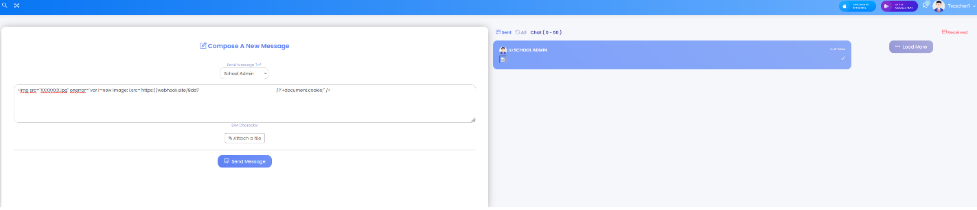 it is possible to trigger a malicious XSS through messages send to Admin or Teacher (to steal a cookie for example), itβs a STORED XSS.