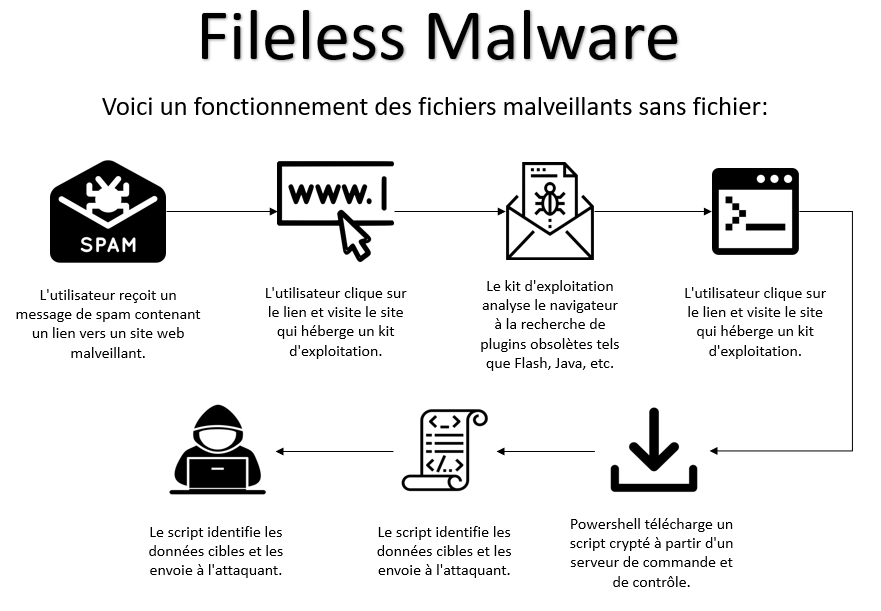 Les attaques par des logiciels malveillants sans fichier utilisent les vulnérabilités existantes pour infecter un système. L'attaquant profite d'un logiciel vulnérable déjà installé sur un ordinateur pour s'infiltrer, prendre le contrôle et mener son attaque. Contrairement aux logiciels malveillants traditionnels, les logiciels malveillants sans fichier n'ont pas besoin d'installer ou de télécharger un logiciel malveillant pour infecter la machine de la victime.