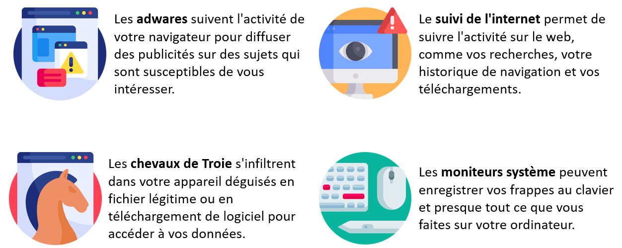 Il existe quatre types courants de logiciels espions. Leur fonction va du suivi de l'activité de votre navigateur pour que les spécialistes du marketing puissent cibler vos intérêts, par exemple, à la surveillance de vos frappes au clavier et de presque tout ce que vous faites sur votre appareil. Voici quelques-unes des tactiques uniques que chaque type de logiciel espion utilise pour vous suivre :