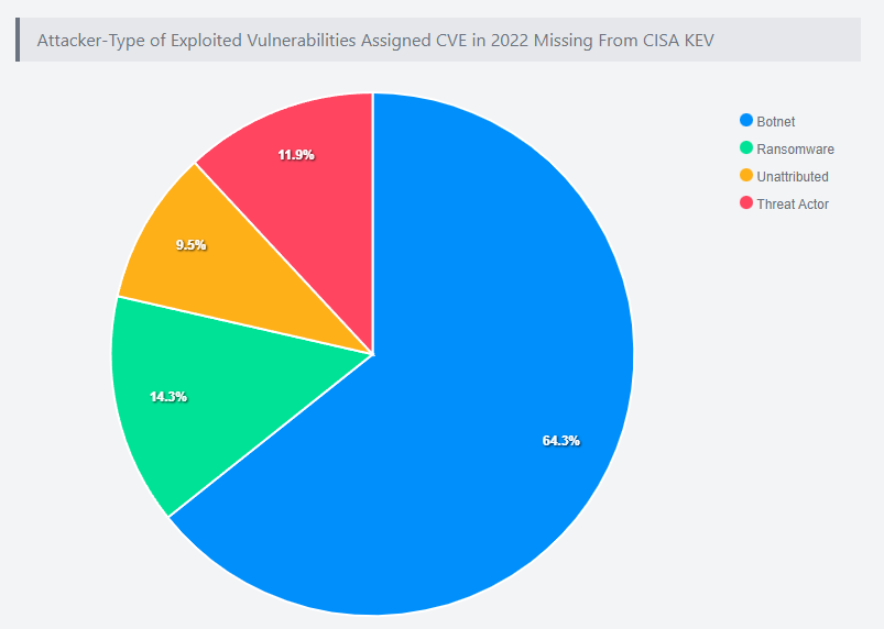 Among the 42 vulnerabilities, an overwhelming majority are linked to exploitation by botnets similar to Mirai (27), followed by ransomware gangs (6) and other threat actors (9).