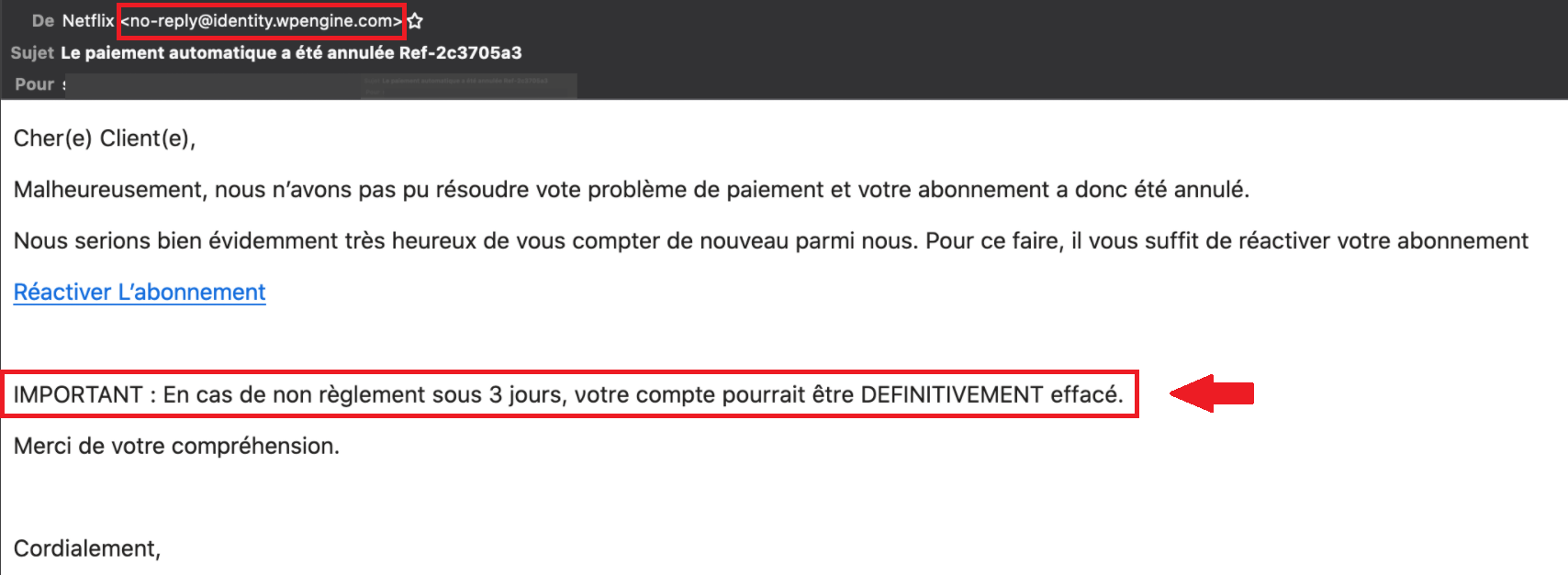 Email addresses and domain names can be easily spoofed. It is therefore essential to check that the domain name is not altered by spelling changes in suspicious emails. Even if they appear to come from a trusted sender, always check twice.
